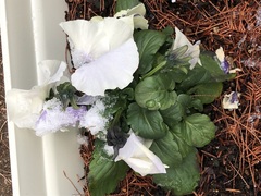 2月8日の昼頃に降った雪の名残が、今朝もプランターの花に残っていました。冷たい中で、負けずに咲いています。