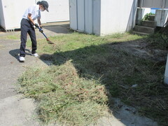 写真は、玄関ホールの砂を掃いているところです。マット裏の砂を掃いています。また、校舎裏の伸びた草を刈り取っています。 大量に取れた草をまとめて、捨てやすいように工夫しています。