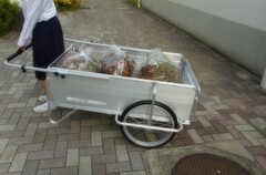 掃除用具に、荷車が加わりました。以前、ストックヤード付近に、木製の古い荷車がありましたが、劣化して使用できませんでした。よって、掃除後のゴミ袋を一人ひとりが手に持って運んでいました。とても重たく、不便を感じていました。ボラ部部員が校長先生に相談に行ったところ、なんと新しい荷台を購入してくださいました。