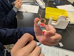 多くの班の仮説は,電子がマグネシウム側から目玉クリップを通って銅側に移動したのではないかというものでした。そこで,そのことを確かめる実験方法を考えることにしました。