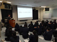 2月10日(火)は、2年生で全体学習を行いました。まず5時間目に、各学級の代表者がレポートを発表しました。鳴門教育大学から畠山輝雄先生にご来校いただき、各生徒の発表後にはコメントをいただいたり質問をしていただいたりして、全体で学びを深めました。続いて6時間目には、畠山先生から「『福祉』とは何かを考える」というタイトルで、福祉において大切な考え方や生徒がこれからどのように関わっていけばいいのかなどのお話をいただき、大変勉強になりました。