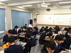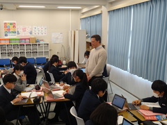 2月4日(火)に校内の研究授業を行いました。この1年間、生徒が各自のタブレットを使い、学習者用デジタル教科書や他のアプリなどを活用しながら学びをデザインする授業に取り組んできました。このスタイルで生徒が学びに取り組んでいる様子を先生方に見ていただくことができました。