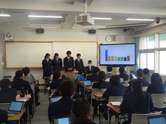 事前に各学級内で大会を実施し,学年大会へ進む2グループが決定しました。計8グループで実施した学年大会では,アイデア力と英語力が求められる中,どの班も素晴らしい発表ができました。