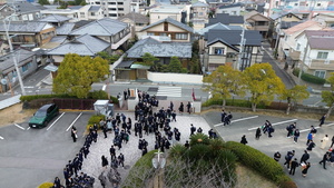 本当に幸せな卒業式を経験させてもらい、感無量でした。式終了後、最終学活をして、教職員、在校生、保護者、来賓の方々も一緒に見送る花道を退場する際に、卒業式の始めのプロローグで流れた「想いでのアルバム」の中でも撮影に登場した「ドローン」を、私が空中でホバリング(停止飛行)させて、その様子を撮影しながら、卒業生を見送りました。在校生や教職員から見送られた後も、校門付近に集まり、写真を取り合ったりして、別れを惜しんでいる様子も上空から撮影しました。多くの保護者から、私にまで感謝のお言葉をいただきましたが、「校長先生のホームページのあの長い文章(!)、いつも読んでいました」と、言っていただいた、お母様がいらして、涙が引っ込みました(笑)。本当に、卒業生の皆さん、保護者の皆様、ご卒業おめでとうございました。