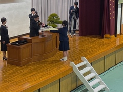 本日この学び舎を巣立つ百二十九名の皆さん、晴れのご卒業、誠におめでとうございます。今、皆さんに授与いたしました卒業証書は、中学校三年間を学び終え、義務教育を終えたことの証です。これまで皆さんを支えてくださった保護者の方々をはじめ、ご家族や先生方など、すべての人々に感謝の気持ちを持ち、卒業証書に込められた多くの期待や願いを静かに胸に刻んで欲しいと思います。