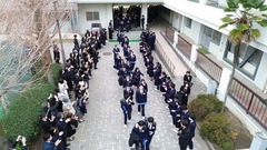 本当に幸せな卒業式を経験させてもらい、感無量でした。式終了後、最終学活をして、教職員、在校生、保護者、来賓の方々も一緒に見送る花道を退場する際に、卒業式の始めのプロローグで流れた「想いでのアルバム」の中でも撮影に登場した「ドローン」を、私が空中でホバリング(停止飛行)させて、その様子を撮影しながら、卒業生を見送りました。在校生や教職員から見送られた後も、校門付近に集まり、写真を取り合ったりして、別れを惜しんでいる様子も上空から撮影しました。多くの保護者から、私にまで感謝のお言葉をいただきましたが、「校長先生のホームページのあの長い文章(!)、いつも読んでいました」と、言っていただいた、お母様がいらして、涙が引っ込みました(笑)。本当に、卒業生の皆さん、保護者の皆様、ご卒業おめでとうございました。